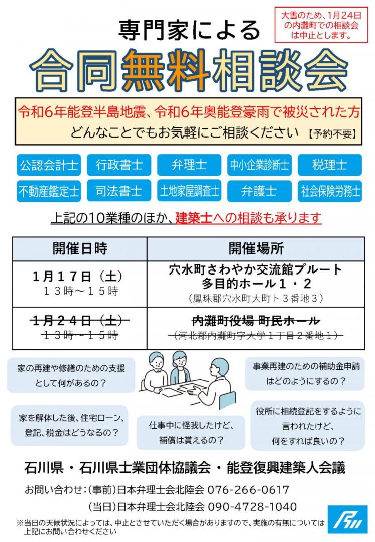 1月24日(土)に内灘町にて開催を予定しておりました相談会は、
