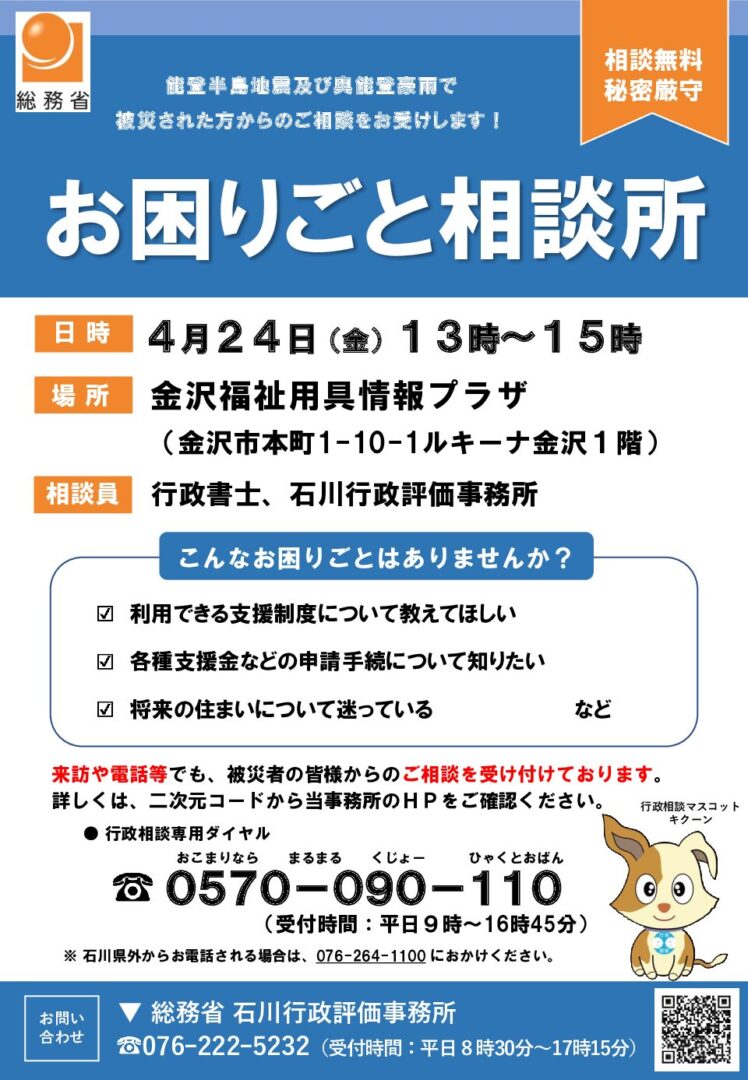 総務省石川行政評価事務所では、令和6年能登半島地震・奥能登豪雨で被災された方のための