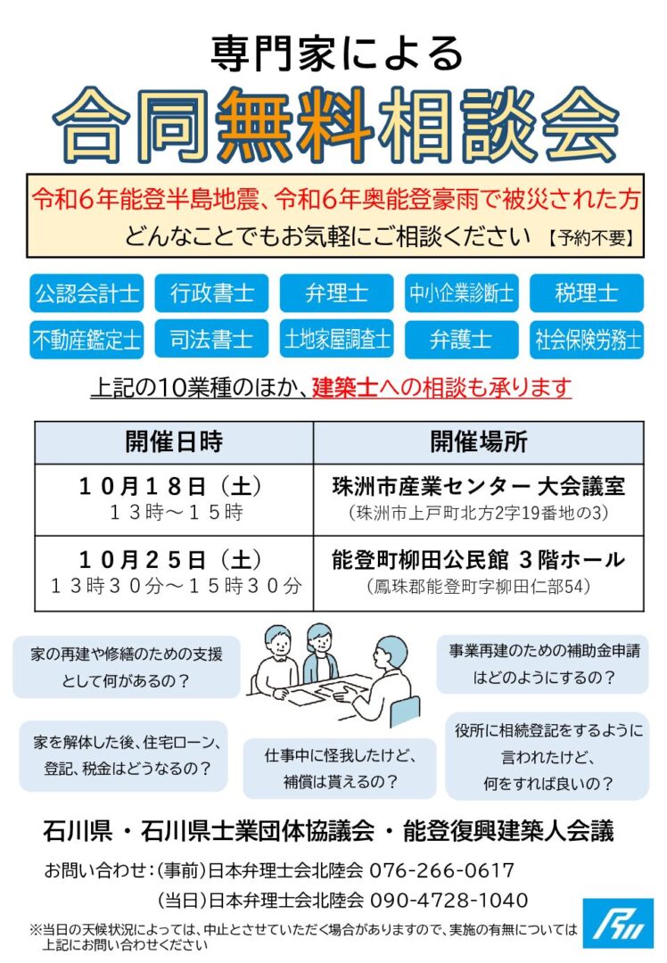 石川県の士業団体では、珠洲市および能登町にて「 専門家による合同無料相談会 」を実施いたします。