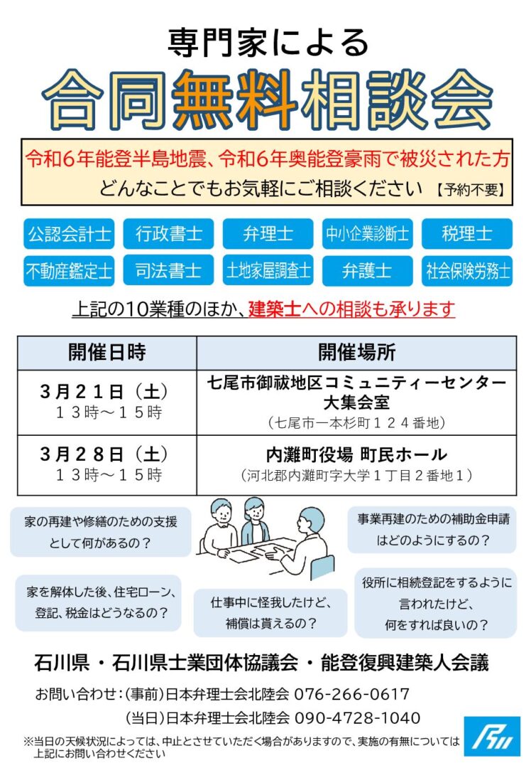石川県の士業団体では、七尾市および内灘町にて「 専門家による合同無料相談会 」を実施いたします。