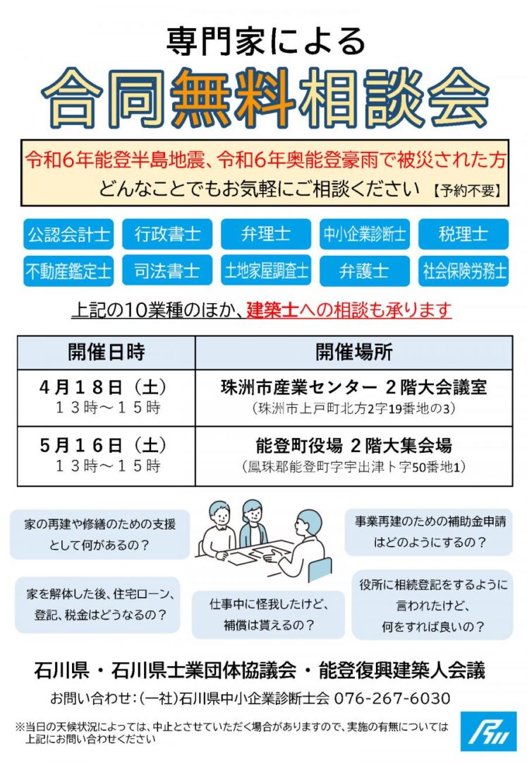 石川県の士業団体では、珠洲市および能登町にて「 専門家による合同無料相談会 」を実施いたします。