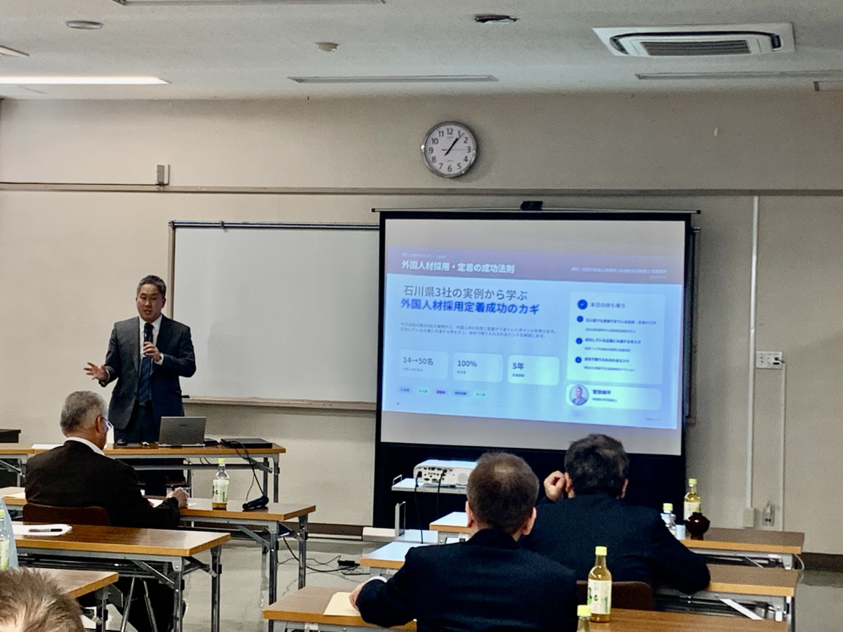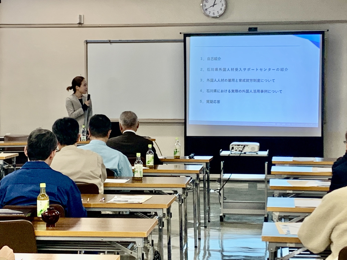 後半では、菅原が、県内企業が直面している人材不足の現状を踏まえ、石川県内における外国人材活用の具体的な事例を紹介するとともに、人材採用や定着に向けたポイントについてお伝えしました。